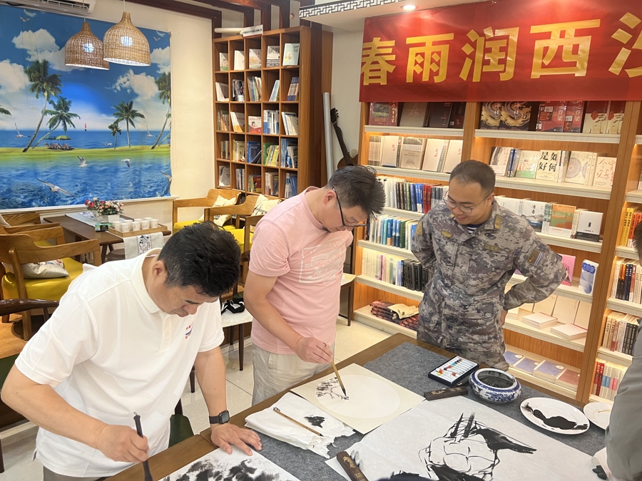 在非遗手工艺展示体验区域,非遗大师们现场展示各类非遗作品,开展文创交流活动,让中华优秀传统文化在南海岛礁扎根传承,也让守岛军民近距离领略非遗文化的独特魅力,共享优质文化发展成果。与此同时,书画交流活动现场墨香四溢,上海市杨浦区美术家协会副主席、上海书画院签约画师李晓波现场提笔创作,多位书画名家以碧海蓝天为创作背景,以戍边守疆精神为创作核心,创作出主题突出、意境悠远的书法和国画作品。书画家们还与驻岛军警民面对面互动,现场赠送画作、题写书法,用笔墨丹青抒发家国大爱,向坚守海岛的英雄们致以崇高敬意,描绘出上海与三沙同心携手、军民守望相助的暖心画卷。